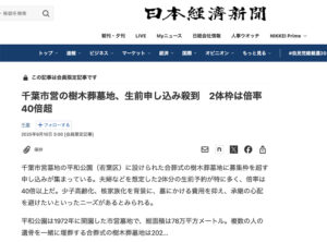 - 千葉市営の合葬式樹木葬墓地、生前申し込み殺到 2体枠は倍率40倍超千葉市営墓地の平和公園(若葉区)に設けられた合葬式の樹木葬墓地に募集枠を超す申し込みが集まっている。夫婦などを想定した2体分の生前予約が特に多く、倍率は40倍以上だ。少子高齢化、核家族化を背景に、墓にかける費用を抑え、承 […]