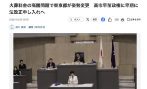 - 火葬料金の高騰問題で東京都が姿勢変更東京都は都議会第3回定例会(3定、9月24日~10月9日)で、23区内の火葬料金高騰問題を巡る姿勢を改め、国に必要な法改正を求めていく方針を示した。3定前後の動きを振り返り、今後の都の取り組みを探った。(一部抜粋) 引用 […]