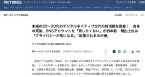 - 自身の死後、SNSアカウントを「残したくない」が約半数。未婚の20~30代のデジタルネイティブ世代の終活観調査。本調査では、自分のSNSアカウントが死後も残ることについて「残ってほしくない(削除してほしい)」人が約半数(47.7%)という結果に。プライバシー保護とデータが永遠に残されることに対して懸念を抱いていることが分かります。 […]