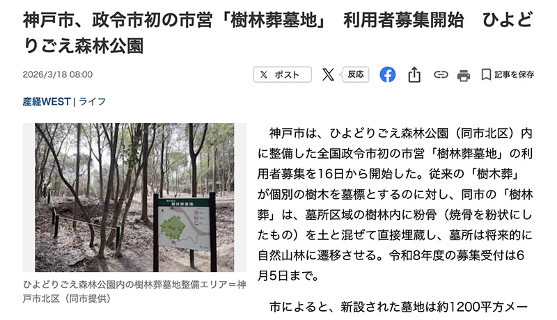 神戸市は、ひよどりごえ森林公園(同市北区)内に整備した全国政令市初の市営「樹林葬墓地」の利用者募集を16日から開始した。従来の「樹木葬」が個別の樹木を墓標とするのに対し、同市の「樹林葬」は、墓所区域の樹林内に粉骨(焼骨を粉状にしたもの)を土と混ぜて直接埋蔵し、墓所は将来的に自然山林に遷移させる。